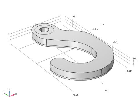 فقط نیمی از هندسه قلاب باید مدل شود، زیرا تقارن مفروض است که به عنوان یک شرط Symmetry در صفحه تقارن اجرا می شود. نمودارهایی برای پس پردازش و بازرسی راه حل در حین حل با استفاده از مجموعه داده Mirror تنظیم می شوند تا راه حل کامل را نشان دهند. هندسه پارامتری است و آزمایش با اندازه های مختلف قلاب را آسان می کند، اما به خاطر داشته باشید که اندازه مش به عنوان شعاع فیلتر در نظر گرفته می شود.