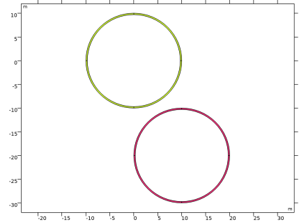 همانطور که در شکل 1 نشان داده شده است ، هندسه 2 بعدی از دو حلقه نازک تشکیل شده است. هر دو حلقه 30 سانتی متر ضخامت دارند و قطر بیرونی آن 20 متر است.