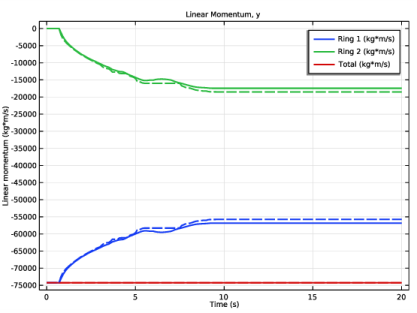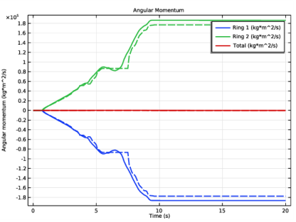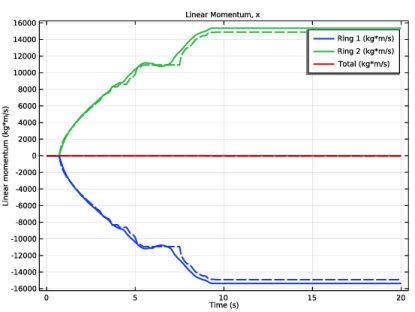 رویداد ضربه را می توان با بررسی کمیت های ترمودینامیکی مختلف به تفصیل مطالعه کرد. شکل 3 و شکل 4 تکانه خطی را برای هر حلقه و برای کل مجموعه نشان می دهد. می توان مشاهده کرد که چگونه تکانه خطی اولیه در جهت y حلقه 1 تا حدی به حلقه 2 منتقل می شود. در طول ضربه، هر دو حلقه در جهت x اما در جهت مخالف حرکت می کنند. نکته مهم این است که می توان مشاهده کرد که تکانه خطی مجموعه در طول رویداد ضربه حفظ می شود. از شکل 5 می توان دید که هر دو حلقه نیز تکانه زاویه ای به دست می آورند که مربوط به حرکت چرخشی مشاهده شده حلقه ها است. تکانه زاویه ای کل نیز به درستی حفظ شده است.