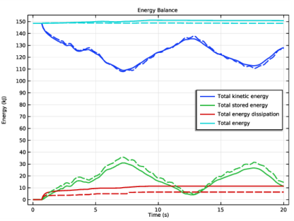 شکل 6 تعادل انرژی مجموعه و اجزای مختلف انرژی کل را نشان می دهد. بخش هایی از انرژی جنبشی اولیه حلقه 1 در حین ضربه و پس از ضربه به انرژی الاستیک تبدیل می شود، زیرا هر دو حلقه تغییر شکل می دهند. همچنین، تماس بین حلقه ها انرژی را از بین می برد زیرا از یک فرمول چسبناک استفاده می شود. انرژی کل در طول شبیه سازی ثابت نگه داشته می شود، به این معنی که مدل از نظر انرژی سازگار است.