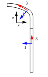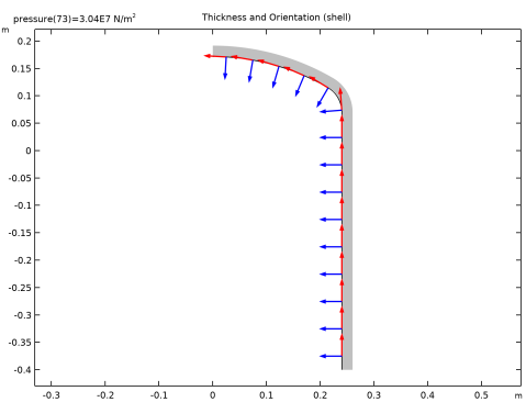 شکل 5 سیستم مرزی و ضخامت پوسته را به تصویر می کشد. فلش های قرمز جهت 1 را نشان می دهند، در حالی که فلش های آبی نشان دهنده جهت 3 هستند. جهت خارج از صفحه به عنوان جهت 2 استفاده می شود (نمودار نیست). حالت نرمال به سمت داخل ظرف جهت گیری می شود، که امکان اعمال مستقیم بار فشار داخلی را فراهم می کند، به شکل 6 مراجعه کنید .
