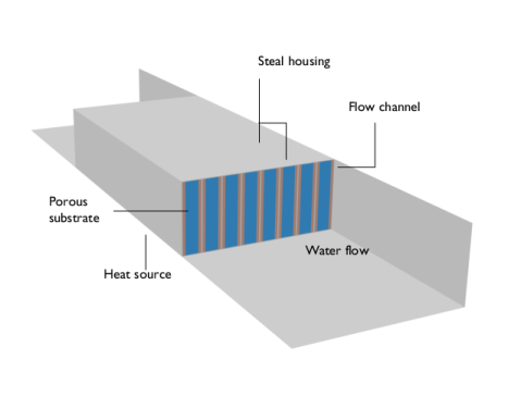 کانال های جریان شامل بلوک های فلزی متخلخل متخلخل با تخلخل ε  = 0.402 در هر طرف هستند. یک منبع حرارتی با q in  = 100 W/cm 2 به پایین متصل شده است. آب با سرعت ورودی u  = 0.2m/s و دمای T در  300 K به عنوان سیال خنک کننده استفاده می شود. جریان به صورت آرام، تراکم ناپذیر و ساکن فرض می شود. خواص جریان نیز مستقل از میدان دما هستند. در داخل حوزه های متخلخل معادله حاکم معادله برینکمن با عبارت تصحیح فورشهایمر است (همچنین به عنوان معادله برینکمن-فورچهایمر یا دارسی-برینکمن-فورچهایمر نیز شناخته می شود). افت فشار به میدان سرعت u as بستگی دارد