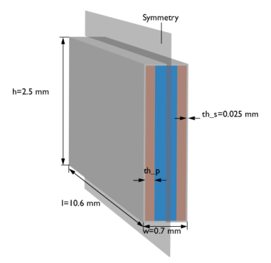 طراحی و شرایط عملیاتی از Ref. 1 و در شکل 1 نشان داده شده است . مشکل را می توان به مدل سازی تنها نیمی از یک کانال کاهش داد. این کافی است، زیرا عملکرد عمدتاً تحت تأثیر افت فشار و انتقال حرارت از مرز پایین به آب در کانال است. هندسه دامنه مدل شده در شکل 2 نشان داده شده است .