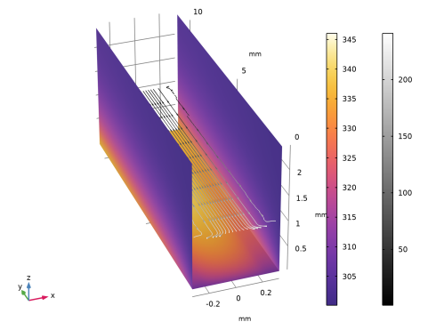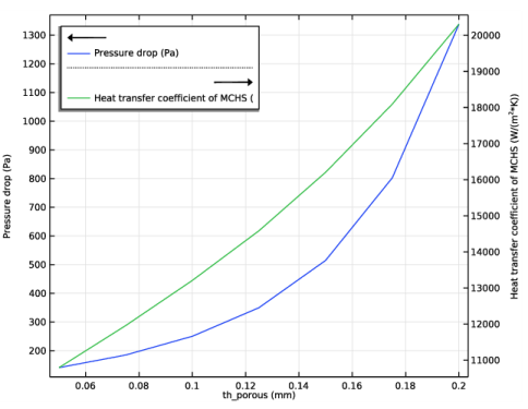 این مدل عملکرد یک سینک حرارتی میکروکانالی (MCHS) با ساختار بلوک متخلخل را مطالعه میکند و عملکرد آن را با یک MCHS معمولی مقایسه میکند. تقاضاهای امروزی در مورد قطعات الکترونیکی برای کوچکتر شدن و کارآمدتر شدن در همان زمان، به همان اندازه تقاضاهای بالایی را برای دستگاه های خنک کننده مربوطه ایجاد می کند. استفاده از مواد متخلخل در امتداد کانال های جریان می تواند انتقال حرارت را با افزایش سطح انتقال حرارت افزایش دهد. در عین حال، افت فشار نیز افزایش مییابد که به قدرت پمپاژ بیشتری نیاز دارد. با یک مطالعه پارامتری بر روی ضخامت بستر متخلخل، یک طراحی بهینه از MCHS متخلخل را می توان یافت.