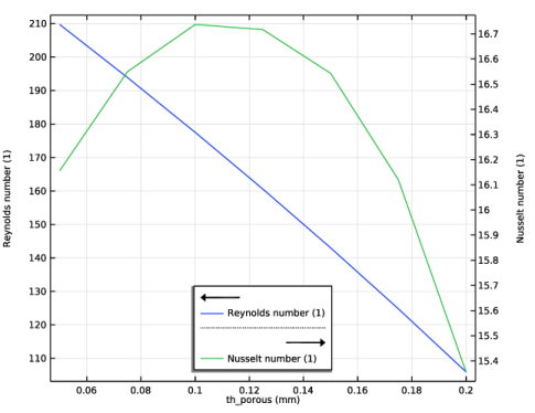 شکل 6 نشان می دهد که چگونه اعداد بی بعد رینولدز و ناسلت به این ضخامت بستگی دارند. عدد رینولدز با افزایش th p کاهش می یابد و در محدوده 100 تا 210 تغییر می کند، به این معنی که انتخاب معادله برینکمن-فورچهایمر موجه است. عدد ناسلت حداکثر در th p  = 0.125 میلی متر است.