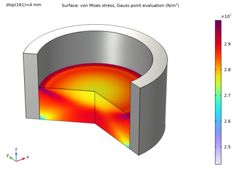 شکل 2 تنش فون میزس را در انتهای تراکم برای قالب پودر دارویی نشان می دهد. تنش در حاشیه بالا حداکثر و در حاشیه پایین کمتر است. حلقه های تنش بالاتر و پایین تر در سطوح بالا و پایین قالب فشرده قابل مشاهده است که با مشاهدات تجربی مطابقت دارد. رجوع کنید به رفر. 1 .