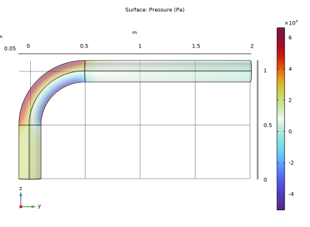 هندسه مدل از دو قسمت لوله استوانه ای مستقیم تشکیل شده است که طول هر کدام 50 سانتی متر و قطر آن 20 سانتی متر است. بخش های مستقیم توسط یک خم لوله 90 درجه با شعاع انحنای 50 سانتی متر به هم متصل می شوند. این لوله برای انتقال آب در دمای اتاق با حداکثر سرعت ورودی 20 متر بر ثانیه استفاده می شود. فقط نیمی از لوله مدل سازی شده است زیرا صفحه xy یک صفحه تقارن است. آب به عنوان یک سیال تراکم ناپذیر در نظر گرفته می شود.