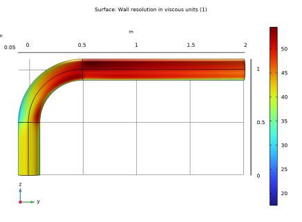 توزیع سرعت حاصل در شکل 1 نشان داده شده است . بعد از خم یک ناحیه جداسازی وجود دارد که با نتایج در Ref. 1 . طول لوله خروجی بیشتر از طول لوله ورودی به منظور رفع این ناحیه ساخته شد. شکل 2 نمودار کانتوری از توزیع فشار مربوطه را نشان می دهد. وضوح دیوار در واحدهای چسبناک در شکل 3 نشان داده شده است . این مقدار در همه جا کمتر از 100 است، که نشان می دهد مش مرزی روی دیوارها به اندازه کافی تصفیه شده است.