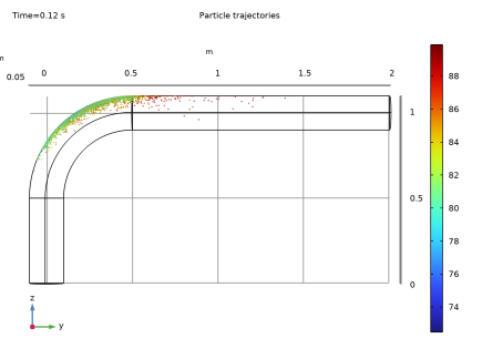 مسیر ذرات در شکل 4 نشان داده شده است . شرط ناپدید شدن دیوار برای پنهان کردن ذراتی که در خم لوله حرکت می کنند بدون تماس با دیوارها استفاده شده است، بنابراین فقط ذراتی که با سطوح خم لوله تماس داشته اند نشان داده می شوند. بیان رنگ زاویه برخورد حاد بر حسب درجه است که از سطح نرمال اندازه گیری می شود. واضح است که ذرات فقط در زوایای چرا به سطح برخورد می کنند.
