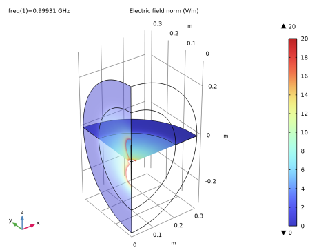 آنتن در یک حوزه هوای کروی قرار می گیرد که توسط یک لایه کاملاً منطبق (PML) احاطه شده است که تابش آنتن را با حداقل بازتاب جذب می کند.