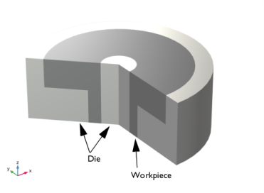 هندسه قطعه کار (پودر فلز) و قالب در شکل 1 نشان داده شده است . پانچ که قطعه کار را فشرده می کند مدل سازی نشده است. در عوض، یک جابجایی تجویز شده در جهت عادی برای فشرده سازی پودر استفاده می شود. با توجه به تقارن محوری، اندازه مدل را می توان کاهش داد.