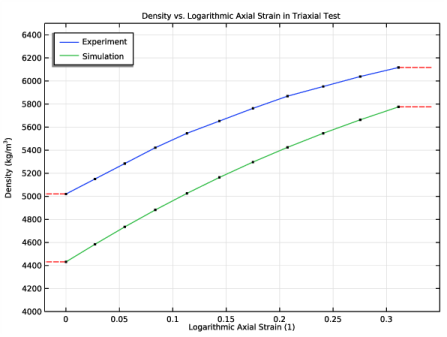 همانطور که در بخش مقدمه این مستندات بحث شد، فشرده سازی همسانگرد و تست های سه محوری با همان مدل مواد و خواص انجام می شود. با این حال، این آزمون ها بخشی از مثال نیستند و فقط نتایج برای اعتبار سنجی ارائه می شوند. نمونه ای با ارتفاع اولیه 24 میلی متر و قطر 20 میلی متر استفاده شد. رجوع کنید به رفر. 1 . آزمایش سه محوری با فشرده سازی نمونه به صورت همسانگرد تا 50 مگاپاسکال و سپس فشرده سازی محوری آن در حالی که فشار شعاعی در 50 مگاپاسکال ثابت نگه داشته می شود، انجام می شود.