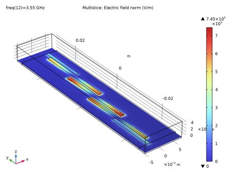 شکل 2: مدل فیلتر گذر باند کوپل شده. محدوده رنگ برای تأکید بر رزونانس روی خطوط میکرواستریپ کوچک شده است.