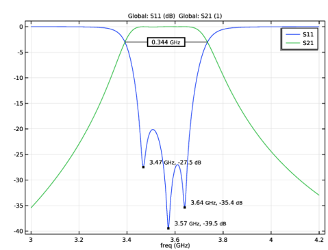 شکل 3 S 11 و S 21 را در اطراف فرکانس باند گذر نشان می دهد. رد خارج از باند عالی مشاهده می شود. شکاف های کوپلینگ را می توان بیشتر برای بهینه سازی پاسخ فرکانسی تنظیم کرد.