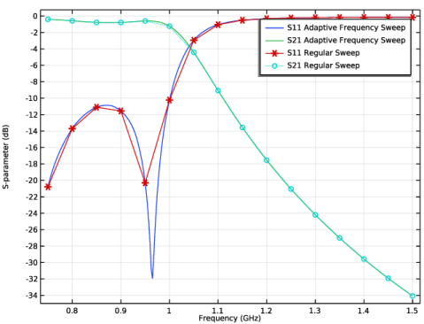 همان مدل فیلتر را با وضوح فرکانس بسیار بهتر با استفاده از جابجایی فرکانس تطبیقی بر اساس ارزیابی شکل موج مجانبی (AWE) تحلیل کنید. هنگامی که یک دستگاه یک پاسخ فرکانسی به آرامی متغیر ارائه می دهد، روش AWE زمان حل سریع تری را هنگام اجرای شبیه سازی در بسیاری از نقاط فرکانس ارائه می دهد. مثال زیر با جابجایی فرکانس تطبیقی را می توان حدود ده برابر سریعتر از جاروهای دامنه فرکانس معمولی با وضوح فرکانس یکسان محاسبه کرد.
