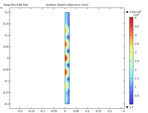 نمودار پیش فرض هنجار میدان الکتریکی در موجبر را نشان می دهد. الگوی موج ایستاده در هر بخش تقسیم شده از موجبر در فرکانس 4.98 گیگاهرتز نشان می دهد که این یک فرکانس تشدید است. همچنین از نظر کیفی نشان می دهد که هر بخش تقسیم شده از موجبر به عنوان یک حفره با انتهای باز در عنبیه ها عمل می کند.