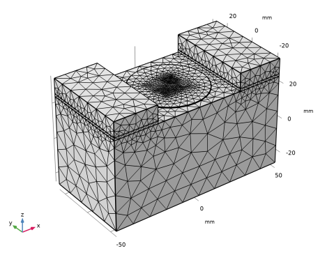 مدل را با استفاده از یک شبکه چهار وجهی با تقریباً پنج عنصر در هر طول موج در هر ماده در بالاترین فرکانس شبیه سازی مش کنید. هنگامی که دستگاه پیزو به دلیل بایاس ورودی تغییر شکل می دهد، رابط مش متحرک برای تغییر شکل مش برای فیزیک امواج الکترومغناطیسی استفاده می شود.