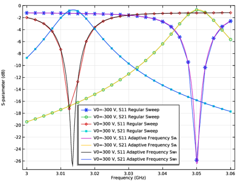 پارامترهای S رسم شده در شکل 4 اثر انحراف دستگاه پیزو را بر فرکانس تشدید فیلتر نشان می دهد. محدوده فرکانس قابل تنظیم این مثال ~40 مگاهرتز است. این محدوده را می توان با انتخاب های مختلف اندازه دیسک پیزو و ولتاژ بایاس ورودی تنظیم کرد.