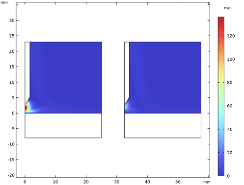 شکل 1: نمودار بزرگی سرعت سیال در پیک فعلی 160 A (سمت چپ) و کف فعلی 80 A (راست).