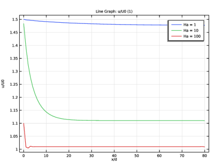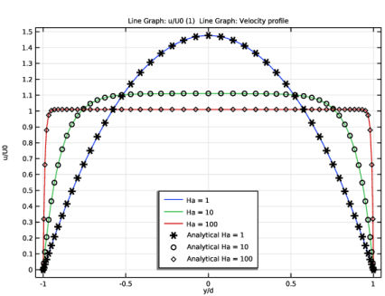 که در آن U  =  u / U 0 سرعت u نرمال شده به سرعت متوسط ورودی U 0 است ، Y  =  y / d موقعیت نرمال شده به فاصله بین صفحات بدون لغزش 2 d و عدد هارتمن Ha  = μ H 0 است. d نسبت نیروهای الکترومغناطیسی به ویسکوز است که در آن μ نفوذپذیری مغناطیسی، H 0 قدرت میدان مغناطیسی تحمیلی، σ هدایت الکتریکی، ρ چگالی جرم، و