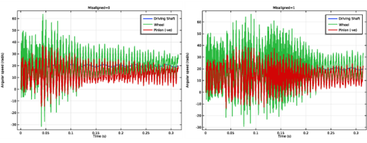 شکل 3 مقایسه سرعت های زاویه ای چرخ و پینیون را برای موارد یک یاتاقان تراز و ناهمتراز نشان می دهد. ارتعاش پیچشی کمی بالاتر برای مورد یاتاقان نامناسب وجود دارد. ارتعاشات لرزان در مورد نامناسب نیز برای مدت طولانیتری باقی میمانند.