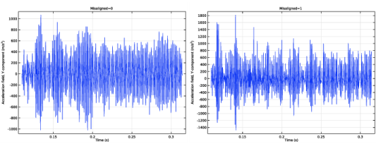 شکل 4: شتاب محوری در چرخ، برای یاتاقان های تراز شده (چپ)، و برای یاتاقان های نامناسب (راست).
