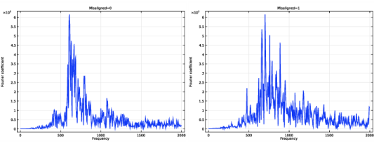 طیف فرکانس برای ارتعاشات محوری در شکل 5 نشان داده شده است . در مقایسه با یاتاقانهای تراز، مورد یاتاقانهای نامناسب مشارکت طیف وسیعتری از فرکانسها را نشان میدهد. دامنه ارتعاش در فرکانسهای بالاتر در موارد نامناسب به طور قابلتوجهی بیشتر است.