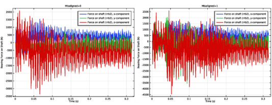 شکل 6 مؤلفه های نیروی باربری را برای یاتاقان 2 نشان می دهد. موردی که یاتاقان در آن تراز است در سمت چپ و موردی که در آن تراز نادرست است در سمت راست نشان داده شده است. در مواردی که تراز نادرست هستند، تغییرات نیرو کمی بزرگتر است و دارای فرکانس های بالاتر است.