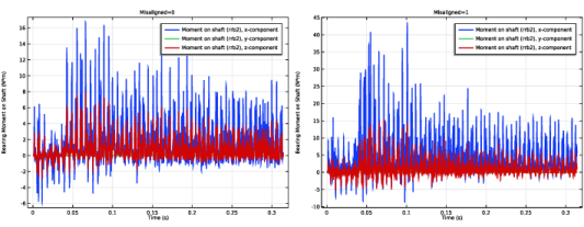 شکل 7 گشتاورهای در یاتاقان 2 را مقایسه می کند. نتیجه برای یاتاقان های تراز شده در سمت چپ و برای یاتاقان های نامرتب در سمت راست ارائه شده است. می توان به وضوح یک لحظه بزرگ را در مورد محور x در حالت نامناسب مشاهده کرد. ممان حول محور z نیز در حالت نامرتب دارای تغییرات دامنه کمی بالاتر است.