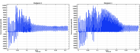 نیروی تماس مش دنده برای موارد یاتاقان های تراز و ناهمتراز در شکل 9 نشان داده شده است . در طول ارتعاش جغجغه، تماس متناوب در مش بندی چرخ دنده به وضوح قابل مشاهده است. تغییر نیروی تماس فقط تحت تأثیر ناهماهنگی در یاتاقان است، با این حال، پس از بارگذاری شفت، در مواردی که یاتاقان نامناسب باشد، صدای تق تق برای مدت طولانی تری ادامه می یابد.