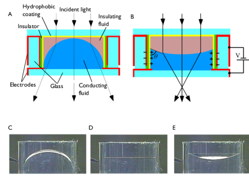 شکل 1: (الف) مقطع شماتیک لنز FluidFocus فیلیپس. (ب) هنگامی که یک ولتاژ اعمال می شود، اثر خیس شدن الکتریکی زاویه تماس و در نتیجه فاصله کانونی لنز را تغییر می دهد. (C) تا (E) اشکال یک عدسی با قطر 6 میلیمتر که به ترتیب با ولتاژ 0 ولت، 100 ولت و 120 ولت گرفته شده است. نمودارها و عکس ها: فیلیپس.