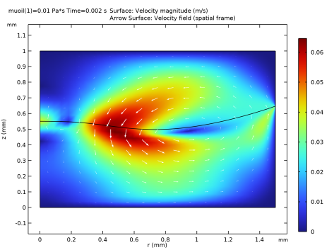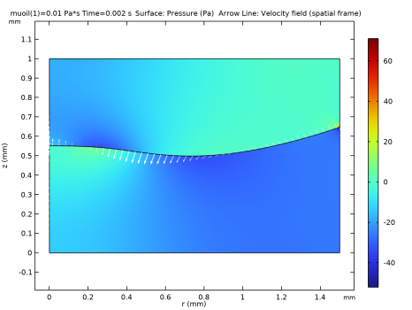 شکل 5: فشار در سیال (رنگ) و سرعت مرز (فلش) برای یک لنز 2 ms پس از تغییر ولتاژ از 100 ولت به 120 ولت. ویسکوزیته سیال عایق 10 mPa·s است.