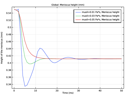 واضح است که برای عملکرد بهینه لنز، نوسان منیسک باید با بیشترین سرعت ممکن کاهش یابد. بنابراین سیستم باید به شدت میرایی شود. از آنجایی که ویسکوزیته سیال عایق را می توان با تغییر ترکیب آن تغییر داد، می توان میرایی را تنظیم کرد و از این رو عدسی با سریع ترین زمان پاسخ ممکن تولید کرد. شکل 6 پاسخ سیستم را برای سه مقدار مختلف ویسکوزیته سیال عایق نشان می دهد. از این نمودار مشخص است که ویسکوزیته 50 mPa·s سیستمی را تولید می کند که نزدیک به میرایی بحرانی است.