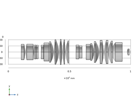 هنگام ساخت یک هندسه در COMSOL برای استفاده در ردیابی پرتوهای اپتیک هندسی، مهم است که بدانیم ترتیب قرارگیری عناصر نوری در یک دنباله هندسی بر نتایج ردیابی تأثیر نمیگذارد. با این حال، قرار دادن عناصر نوری نسبت به یکدیگر راحت است. این را می توان با در نظر گرفتن یکی از صفحات کاری داخلی در یک نمونه قطعه به عنوان مرجع برای قرار دادن نمونه قطعه بعدی به دست آورد. توالی هندسه عدسی حاصل در شکل 1 نشان داده شده است . دستورالعمل های دقیق برای ایجاد هندسه را می توان در پیوست – دستورالعمل هندسه یافت .