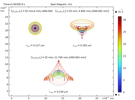 نمودار پرتوی عدسی میکرولیتوگرافی برای سه زاویه میدان مختلف در شکل 2 نشان داده شده است . برای هر یک از سه زاویه میدان، میانگین موقعیت پرتو در صفحه تصویر محاسبه میشود و سپس فاصله موقعیت نهایی هر پرتو تا این موقعیت متوسط محاسبه میشود و بیان رنگ در امتداد پرتوها را تشکیل میدهد.