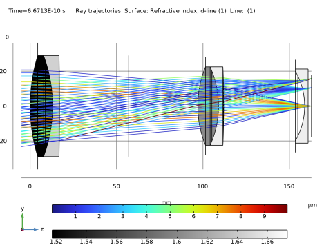 شکل 1: نمای کلی لنز پتزوال. لنز شامل یک عنصر صاف کننده میدان است. در این نما، پرتوهای حاشیه ای یک ردیابی روی محور، همراه با پرتو اصلی 5 میدان اضافی نشان داده شده است.