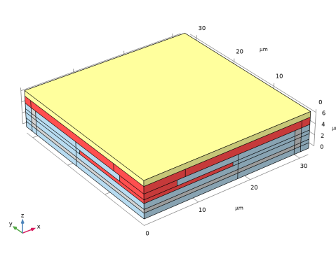 این مدل یک مدل سه بعدی از یک ربع دستگاه است. به دلیل تقارن چهار برابری آن و تحلیل های مورد نیاز، نیازی به مدل سازی صریح کل دستگاه نیست. شکل 1 مدلی را نشان می دهد که شامل لایه های دی الکتریک، فلز و غیرفعال می شود. ابعاد مدل عبارتند از: