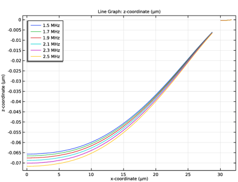 شکل 4 نمایه سطح مقطع الکترود بالایی را به عنوان تابعی از فرکانس نشان می دهد. حداکثر جابجایی در مرکز دستگاه و 13 نانومتر در 2.1 مگاهرتز است.