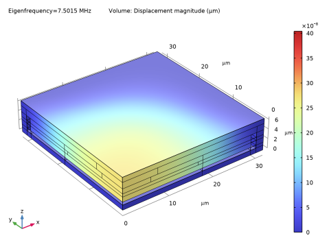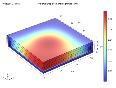هندسه مدل کاملاً پارامتری شده است تا امکان تغییرات آسان در ساختار دستگاه را فراهم کند تا فرکانس تشدید خاصی را هدف قرار دهد. این مدل یک مسئله چندفیزیکی مربوط به نیروی الکترومکانیکی را حل می‌کند و پاسخ فرکانسی دستگاه را با استفاده از یک مطالعه Prestressed دامنه فرکانس محاسبه می‌کند. دستگاه با استفاده از رابط مدار الکتریکی برای محاسبه جریان خروجی به یک مدار خارجی متصل می شود. این مدل از عملگرهای داخلی برای محاسبه میانگین و حداقل جابجایی روی سطح الکترود برای محاسبه ضریب یکنواختی جابجایی استفاده می‌کند.