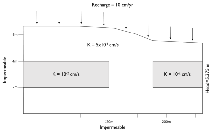 تنظیمات هیدرولوژیکی برای این مشکل در شکل 1 برای جریان آب زیرزمینی در حالت پایدار توضیح داده شده است. آبخوان عمدتاً از ماسه سیلتی ریز دانه با رسانایی هیدرولیکی K1  = 5·10-4 سانتی متر  بر ثانیه با عدسی هایی از مواد نسبتاً کورس هدایت هیدرولیکی K2 = 1  ·10-2 سانتی  متر بر ثانیه تشکیل شده است. به طور کلی، آب زیرزمینی از سطح بالایی منطقه اشباع، سطح ایستابی، به سمت خروجی در x  = 250 متر حرکت می کند. سطح ایستابی یک سطح آزاد است، یعنی فشار سیال برابر با صفر است، که در سراسر آن شارژ مجدد عمودی وجود دارد که با R نشان داده می شود ، 10 سانتی متر بر الف. تقسیم آب زیرزمینی، خطی از تقارن، در x رخ می دهد = 0. پایه آبخوان نفوذناپذیر است.