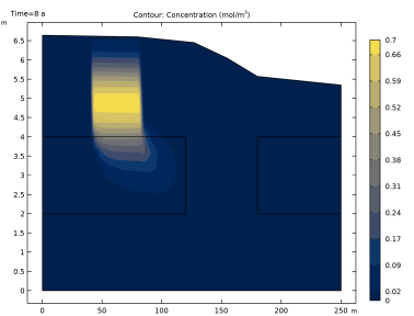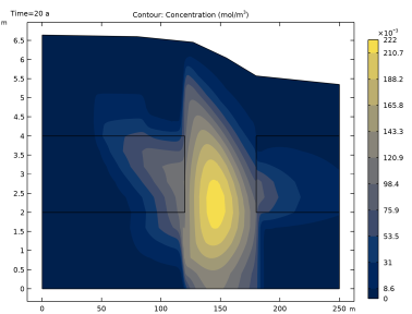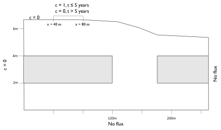 شکل 2 شرایط مربوط به انتقال املاح را نشان می دهد. آبخوان در ابتدا بکر است و غلظت آن برابر با صفر است. برای پنج سال اول، غلظت نسبی 1 در فاصله 40 متر <  x  < 80 متر در سطح آب بارگذاری می شود. منبع املاح در سال 5 حذف می شود و غلظت در امتداد این بخش بلافاصله به صفر می رسد. آلاینده از طریق فرارفت و پراکندگی در داخل آبخوان مهاجرت می کند. در سراسر حوزه، تخلخل، که با ε p نشان داده می شود ، 0.35 است که با معیار، پراکندگی طولی، αL ، و پراکندگی عمودی عرضی، αT نشان داده شده است.، به ترتیب 0.5 متر و 0.005 متر هستند. ضریب نفوذ مولکولی موثر، Dm ، 1.34·10-5 cm2 /  s است .