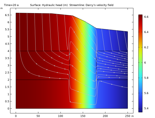 شکل 3 هدهای هیدرولیکی برآورد شده با شبیه سازی جریان آب زیرزمینی حالت پایدار COMSOL Multiphysics را ارائه می دهد. سرهای هیدرولیک و خطوط جریان به خوبی با نتایج معیار ارائه شده توسط Sudicky مطابقت دارند ( مراجعه 2 ). هندسه سطح آب تعیین شده برای شبیه سازی تقریباً هندسه معیار را تکرار می کند. تطابق خوب بین میدان‌های جریان انتظار می‌رود زیرا هندسه اولیه سطح آب مورد استفاده در COMSOL Multiphysics به گونه‌ای طراحی شده است که شباهت زیادی به هندسه معیار داشته باشد.