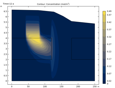 این مدل کاربرد COMSOL Multiphysics را در مورد معیار جریان سیال زیرسطحی حالت پایدار و انتقال املاح گذرا در امتداد یک مقطع عمودی در یک آبخوان نامحدود نشان می‌دهد. به دلیل ناهمگونی عمیق زمین شناسی، مدل باید حمل و نقل املاح را در شرایط جریان بسیار نامنظم با پراکندگی ناهمسانگرد قوی تخمین بزند. Van der Heijde ( مراجعه 1 ) این مورد را به عنوان “سطح 2” طبقه بندی می کند، با ترکیبات پارامترهای بالقوه دشوار کافی برای آزمایش توانایی یک کد برای مقابله با موقعیت های هیدرولوژیکی واقعی. Sudicky ( مراجعه 2 ) این مشکل را برای نشان دادن کد گالرکین تبدیل لاپلاس ایجاد کرد.