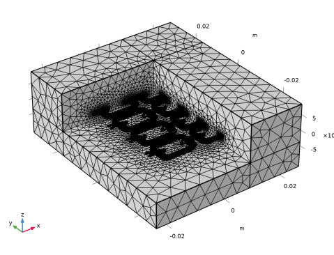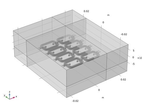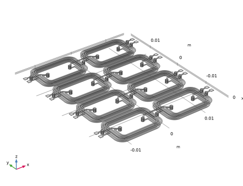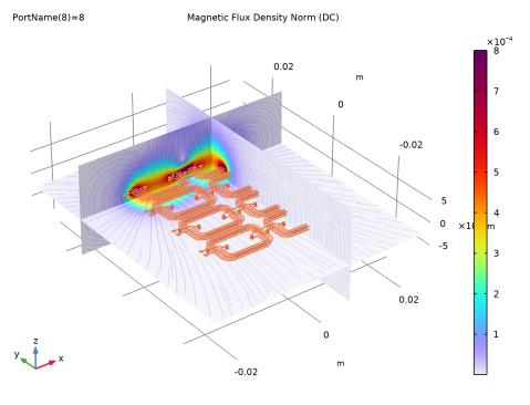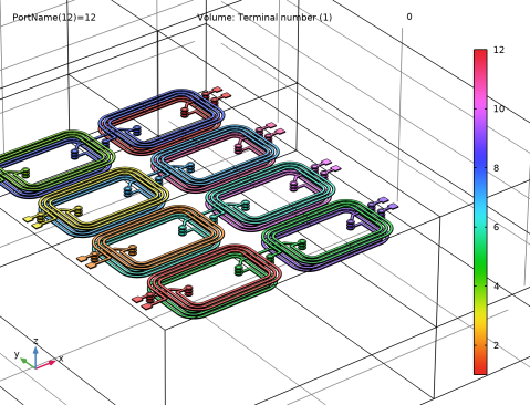 سیمپیچهای PCB با ویژگی Conductor مدلسازی میشوند که میتوان از آن برای تنظیم آسان منابع جریان استفاده کرد. با استفاده از قابلیت Split by Connectivity ، 12 سیم پیچ را می توان به طور خودکار شناسایی کرد و ویژگی های Conductor مربوطه را ایجاد کرد. این کار مراحل راه اندازی رابط فیزیک را بسیار ساده می کند. این مدل با یک مطالعه Stationary Source Sweep با Initialization و همچنین با یک Frequency Domain Source Sweep with Initialization حل شده است . هر دوی اینها به محاسبه ماتریس اندوکتانس توده ای اختصاص داده شده اند.