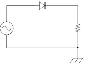 شکل 1: مدار یکسو کننده نیمه موج پایه. یک منبع ولتاژ AC به آند یک دیود pn متصل است. مقاومت نشان دهنده بار مدار است.