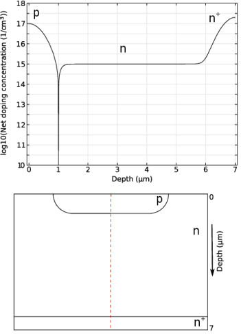 شکل 2 سطح مقطع دستگاه مدل شده و مشخصات دوپینگ را نشان می دهد. دیود دارای عرض 10  میکرومتر و عمق 7  میکرومتر است . طول دیود روی 10  میکرومتر تنظیم شده است (بدون مشبک). یک نوترکیبی شاکلی-رید-هال نیز به مدل اضافه شده است تا نوع نوترکیبی که معمولاً در نیمه هادی های باند شکاف غیرمستقیم مانند سیلیکون مشاهده می شود، شبیه سازی شود، که ماده مورد استفاده در این مثال است. دیود مشبک با استفاده از ترمینال اهمی به مدار نیم موج متصل می شود. برای مدل دیود سیگنال بزرگ، جریان اشباع و ضریب ایده‌آل بر روی مقادیر متناسب با منحنی IV دیود مدل‌سازی شده تنظیم شده‌اند.