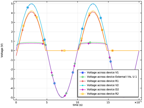 شکل 3 ولتاژهای خروجی به دست آمده از هر دو مدل شبیه سازی سطح کامل و سیگنال بزرگ را نشان می دهد. همانطور که از عملکرد معکوس یک دیود pn انتظار می رود، برش در نیمه منفی موج در دیود رخ می دهد.
