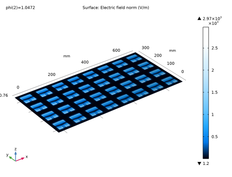 شکل 3 هنجار میدان الکتریکی را زمانی که همه عناصر آنتن با ولتاژ یکسان برانگیخته میشوند، نشان میدهد، اما پیشروی فاز حسابی طوری تنظیم شده است که حداکثر جهت تابش را از محور z – کج کند. شدت میدان قوی در اطراف لبه های تابشی آنتن های پچ مشاهده می شود. از آنجایی که هنجار ترسیم شده است، تغییر فاز نشان داده نمی شود. برای مشاهده تغییرات فیلد در هر ستون آرایه، یک جزء فیلد با ارزش پیچیده، E z ، در شکل 4 استفاده شده است . فقط قسمت واقعی مقادیر مختلط رسم می شود.