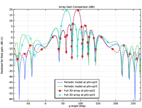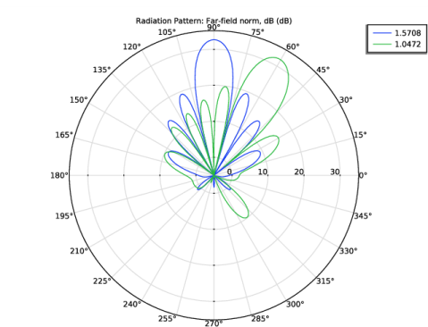 شکل 5 الگوی تابش میدان دور را در یک نمودار قطبی به تصویر می کشد. فرمت پلات قطبی برای بررسی مستقیم خصوصیات جهت آنتن مناسب است. هنگامی که هیچ اختلاف فازی بین پورت های تحریک وجود ندارد و همه عناصر آنتن به طور یکنواخت تغذیه می شوند، الگوی تشعشع تولید شده با صفحه آرایه نرمال است (آبی در شکل 5 ). اگرچه فاز در هر پورت به صورت -2*pi*0.48*cos(phi) تعریف میشود ، آرگومان ورودی عملاً بامقدار phi پارامتر π/ 2 صفر است. وقتی ph π/ 3 است، فاز حسابی برای هر کدام اعمال میشود. گروه ستون آرایه در جدول 3 فهرست شده است .