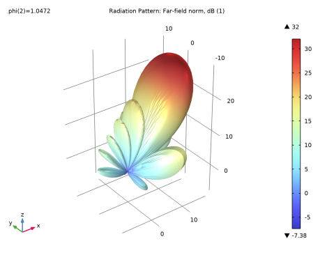 یک آرایه آنتن به خوبی طراحی شده ممکن است سطوح جانبی زیر 10- دسی بل داشته باشد که وقتی در مقیاس خطی رسم می شوند مشخص نیست. مقیاس dB مورد استفاده در طرح قطبی و الگوی تابش میدان دور سه بعدی ( شکل 6 ) باعث می شود که لوب های جانبی بیشتر دیده شوند. برای آنتنهای با بهره بالا، توصیه میشود از رزولوشن بهتری برای تجسم الگوی تابش استفاده کنید تا نوالها و لوبهای جانبی را بدون از دست دادن آنها مشخص کنید. تعداد زوایا در پنجره تنظیمات وضوح را کنترل می کند.
